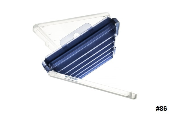 Reversible 86: Una caja para pesca de tamaño reducido que encuentra sitio en cualquier bolsillo, inclusive los de los pantalones. Tiene 6 compartimentos por lado (medida interna 85mm de largo) para señuelos pequeños, EGI, vinilos o accesorios como cabezas plomadas o anzuelos. Medidas externas: 140mm X 104mm X 22mm
