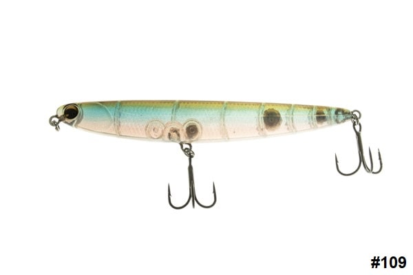 El paseante IMA Skimmer 110es una pieza muy especial entre los mejores señuelos de superficie para lubina y clack bass, ya que tiene la forma del cuerpo estilizado de un stickbait de vinilo de 5 pulgadas
